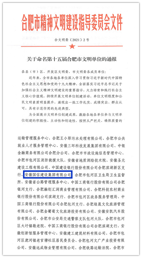 近日,合肥市文明委公布第十五届合肥市文明单位名单,国信集团被授予“第十五届合肥市文明单位”荣誉称号,这是国信集团连续第二届荣获市级文明单位称号。