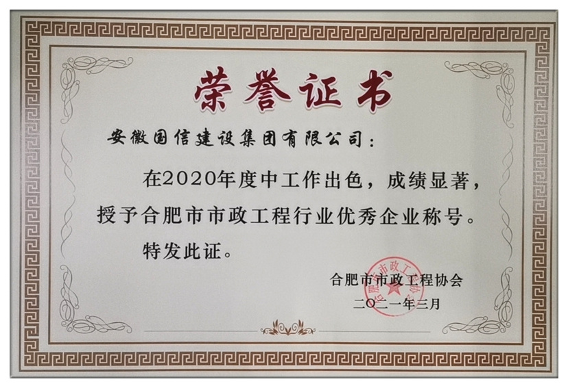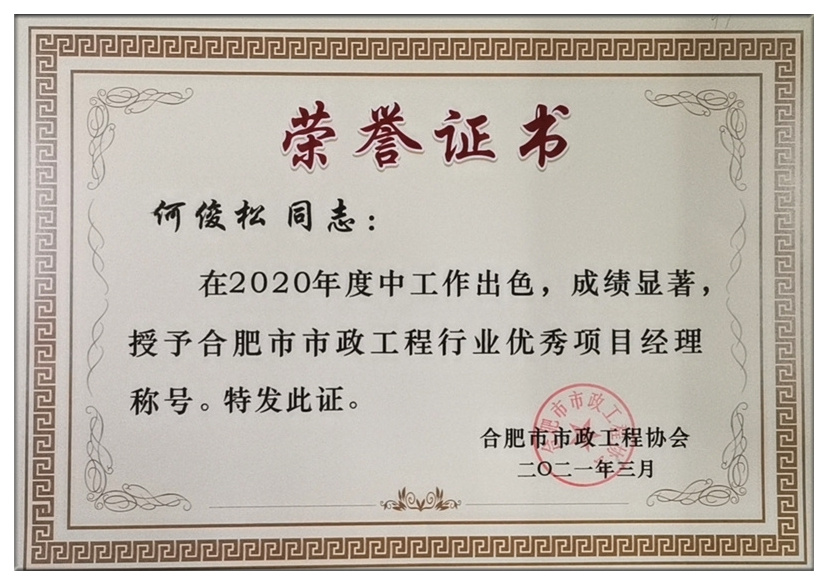 3月15日,合肥市市政工程协会印发表彰决定,国信集团被授予2020年度“合肥市市政工程行业优秀企业”称号,此前已连续多年获此荣誉,何俊松荣获年度“市政工程行业优秀项目经理”称号。