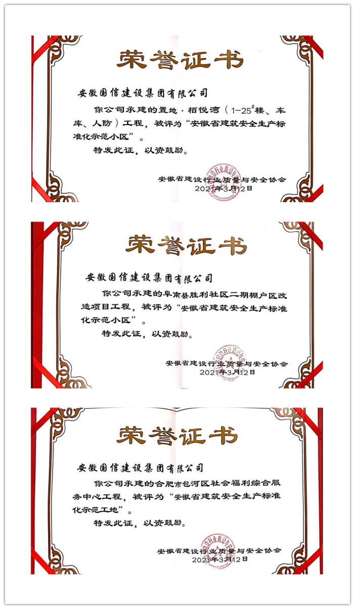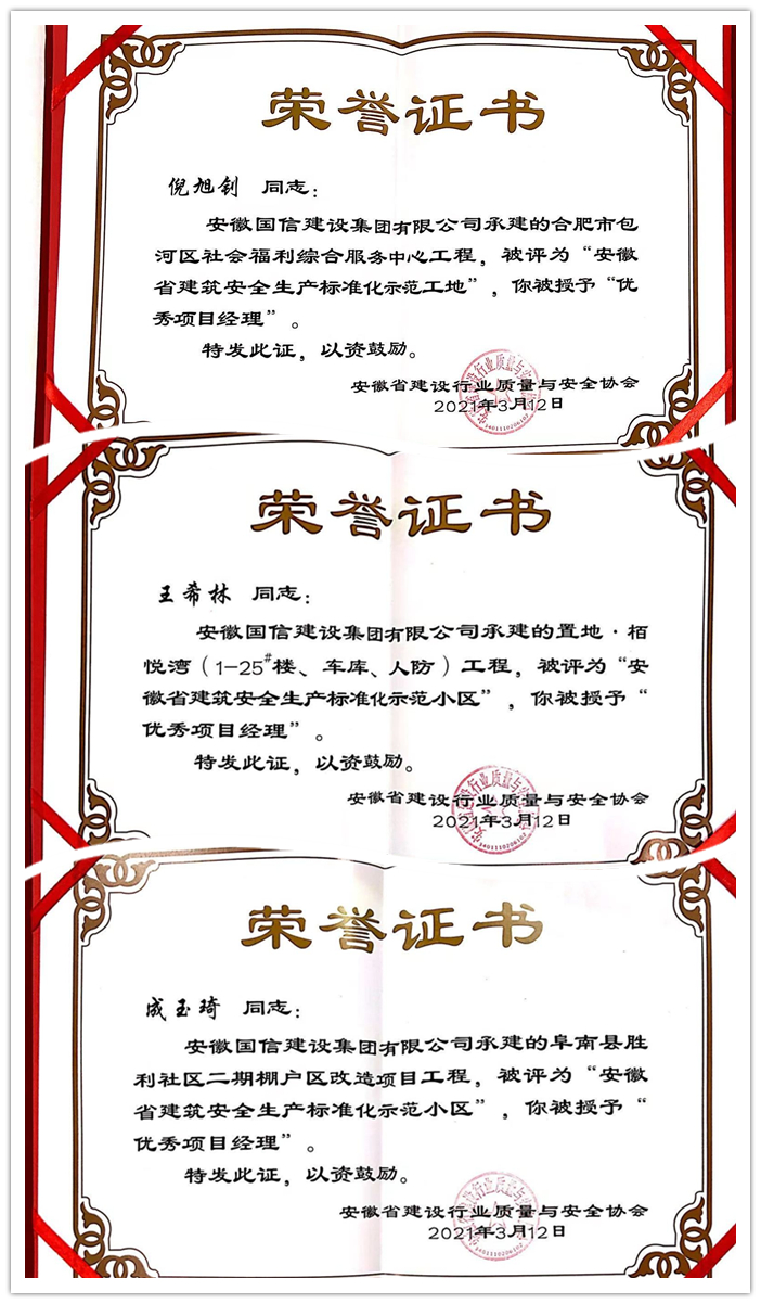 近日,从安徽省建设行业质量与安全协会传来喜讯,由国信集团承建的置地·栢悦湾、合肥市包河区社会福利综合服务中心、阜南县胜利社区二期棚改工程荣获“安徽省建筑安全生产标准化示范工地(小区)”称号,倪旭钊、王希林、成玉琦被授予“优秀项目经理”称号。