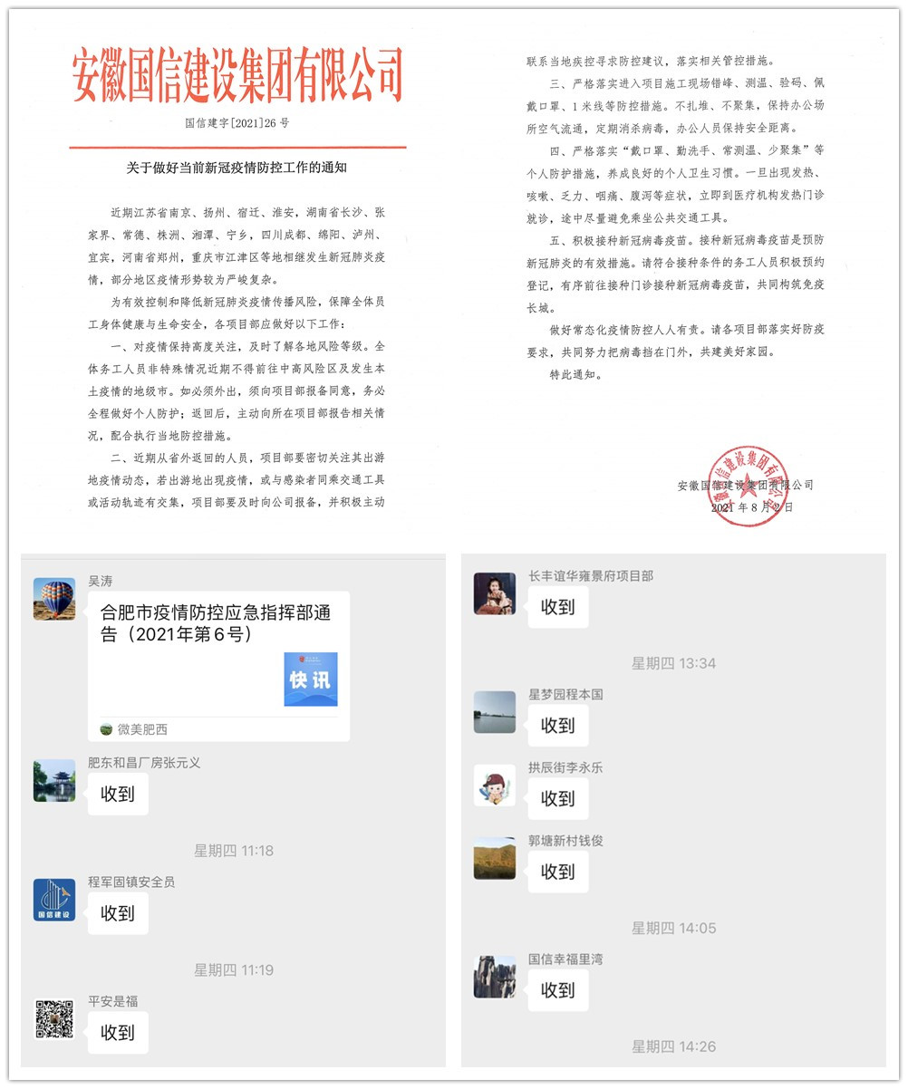 强调疫情局势,牢固防控意识。疫情反弹现象已在全国部分省市范围蔓延,国信集团实时关注疫情发展动态,迅速做出响应,召开专题会议就细化落实疫情防控工作作出具体措施和要求,并下发《关于做好当前新冠疫情防控工作的通知》。通知强调,当前全国疫情形势严峻复杂,多地区出现疫情反弹现象,全员要提高警惕和防控意识,克服麻痹思想,侥幸心态,应当以“临战”状态对待本次全国疫情形势。同时,也要直面当前疫情发展动态,做好自身防护措施,保障自身和工友健康安全。