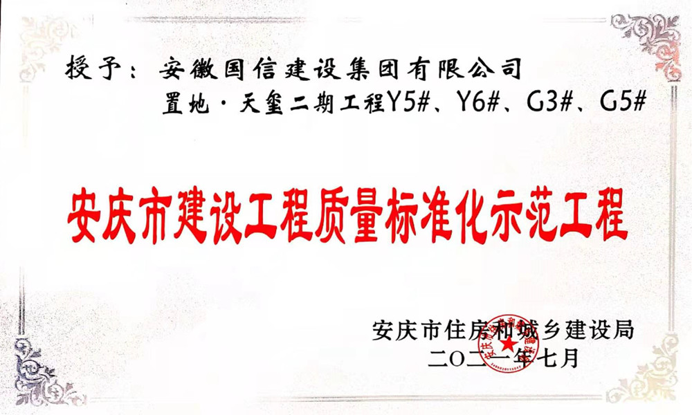 近日,由国信集团承建的置地·天玺二期项目Y5#、Y6#、G3#、G5#楼成功斩获“安庆市建设工程质量标准化示范工程”称号。
