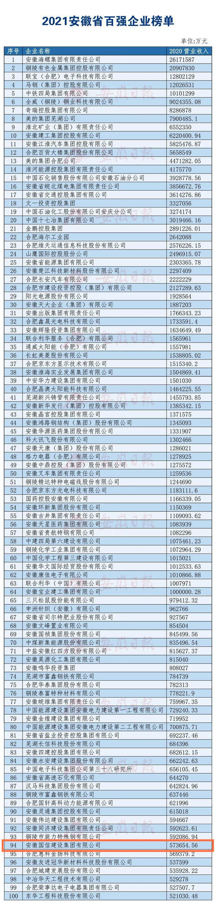 12月7日,安徽省企业联合会、省企业家联合会连续第17次发布“2021安徽百强企业”、“2021安徽制造业百强企业”、“2021安徽服务业百强企业”榜单。国信集团凭借573654.56万元营业收入再次荣获“安徽省百强企业”称号(第94位),这是国信集团继今年荣获“安徽省民营企业百强”称号后获得的又一重大荣誉。