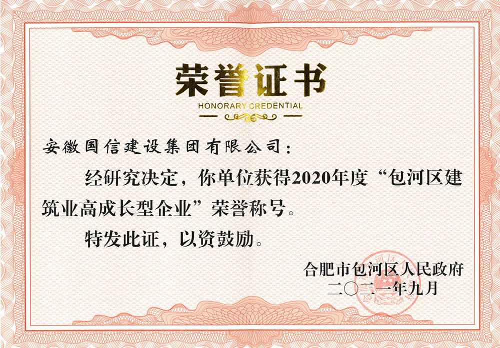 为鼓励先进,树立典型,国信集团被包河区授予了2020年度“包河区建筑业高成长型企业”荣誉称号。