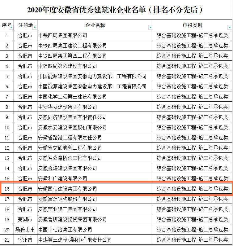 近日,安徽省住房和城乡建设厅公布了“2020年度安徽省优秀建筑业企业”名单,国信集团荣列榜单。