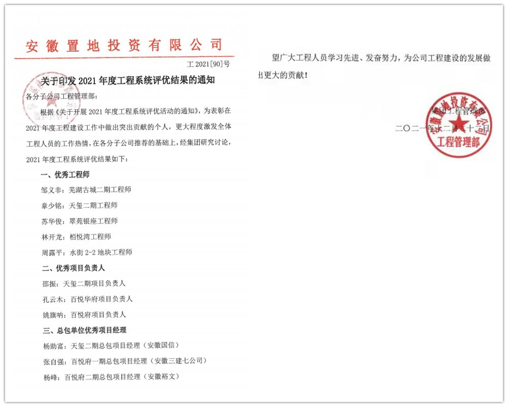 近日,安徽置地公司公布了2021年度工程系统评优结果,天玺二期项目经理杨助富喜获表彰,荣为总包单位优秀项目经理。