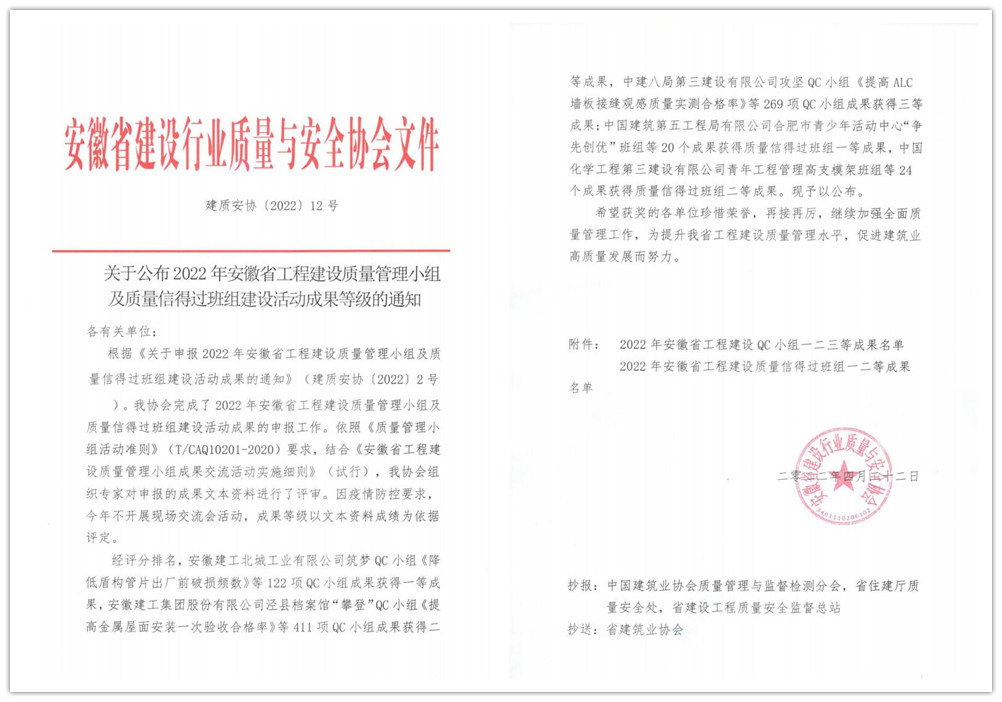 近日,安徽省建设行业质量与安全协会公布了2022年安徽省工程建设质量管理小组及质量信得过班组建设活动成果等级,由国信集团选送的QC小组和质量信得过班组建设成果突出,喜获佳绩。其中,宿州汴北安置四期质量管理小组编制的《提高楼梯施工缝质量合格率》和城东新居QC小组编制的《提高主体结构混凝土实测实量质量合格率》成果荣获2022年安徽省工程建设QC小组活动成果二等奖,宿州市埇桥区城东城中村D、E区安置房项目QC小组编制的《提高屋面细石混凝土保护层质量合格率》,柿树岗乡联圩整村推进安置点项目QC小组编制的《提高地下室外墙防水施工一次合格率》,信达天御S1-15地块项目QC小组编制的《提高砌体施工质量一次验收合格率》成果荣获2022年安徽省工程建设QC小组活动成果三等奖。孙庆伟外墙保温涂料班组和员心平瓦工班组荣获2022年安徽省工程建设质量信得过班组二等奖。