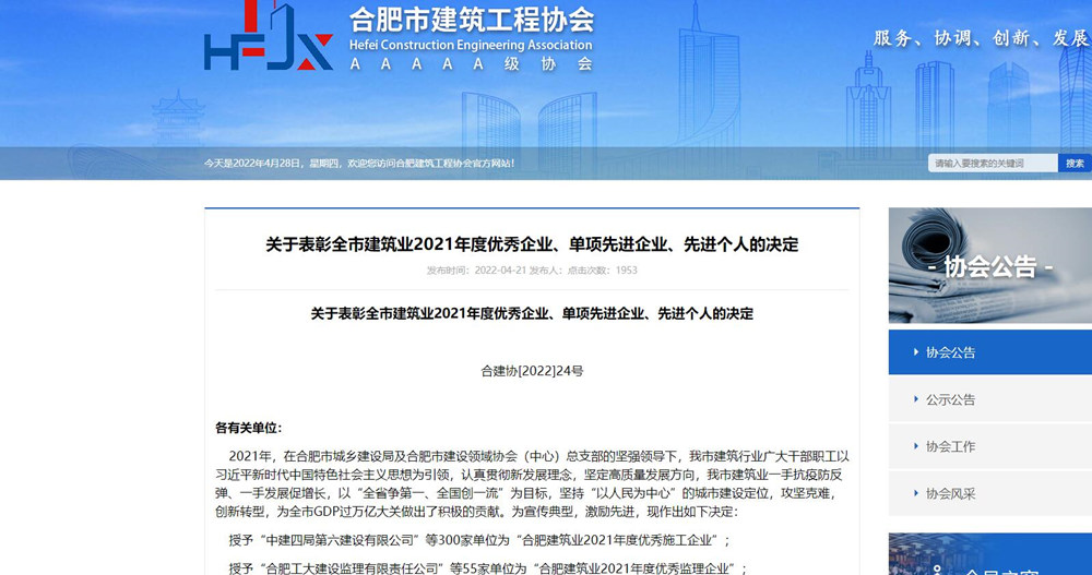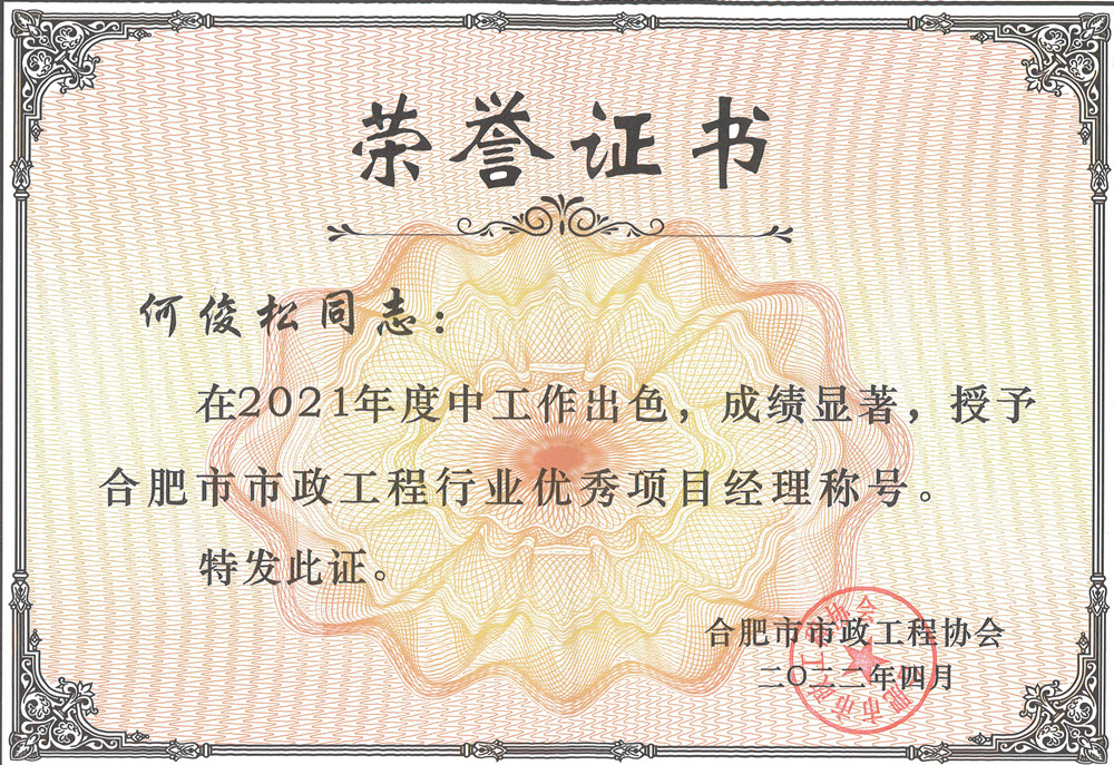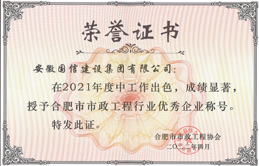 近日,合肥市市政工程协会发布《关于表彰 2021 年度合肥市优秀市政企业、优秀市政项目经理的决定》,国信集团被授予“合肥市市政工程行业优秀企业”称号,何俊松被授予“合肥市市政工程行业优秀项目经理”称号。