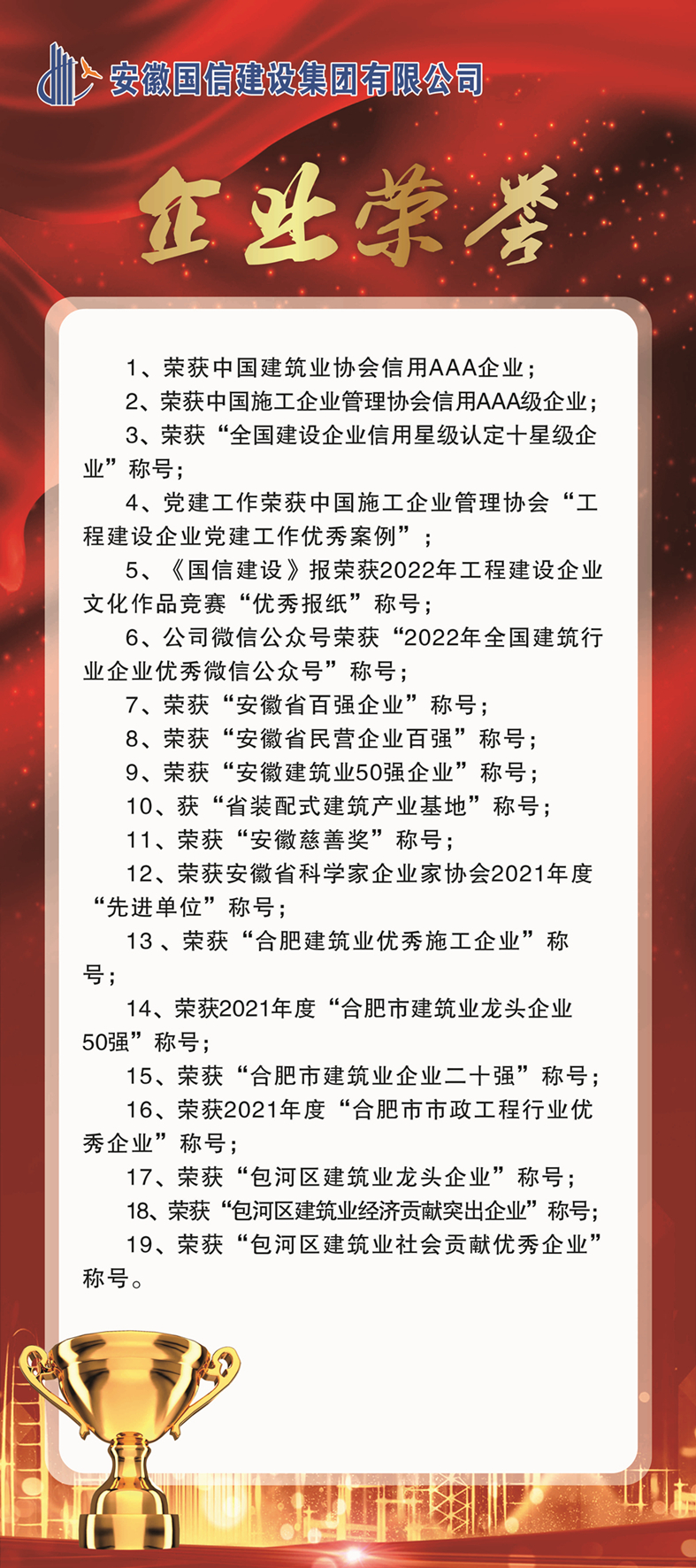 2022年,是党的二十大召开之年,是实施“十四五”规划、全面建设社会主义现代化国家的重要一年,更是国信集团继续稳健前行的又一年。我们认真学习贯彻党的二十大和中央经济工作会议精神,把学习成果转化为推动企业高质量发展的坚实力量,不断增强企业的凝聚力、向心力,奋力打赢疫情防控阻击战、“经济总量突破、发展质量突破”攻坚战、改革创新优化升级阵地战,用坚守和坚韧谱写了践行初心、不辱使命的新篇章。这一年,质量安全形势平稳、工程创优捷报频传;管理提升循序渐进、科技创新步伐加快:市场领域不断拓展、重点工程优质履约;优化升级彰显实力、竞争优势持续增强;文化建设硕果累累,品牌声誉不断提升;从容应对风险挑战、企业发展稳中求进;勇于承担社会责任,努力实现共同富裕。