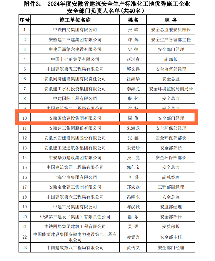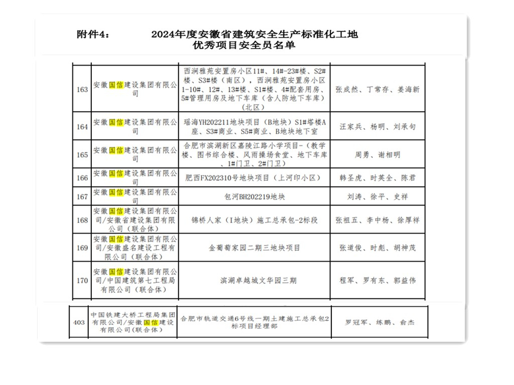 近日,安徽省建设工程质量与安全协会发布2024年度安徽省建筑安全生产标准化工地创建活动中取得优异成绩的单位及个人名单,国信集团榜上有名,获评安徽省建筑安全生产标准化工地优秀施工企业,此外多名安全管理人员获评优秀个人。