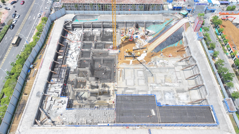 国药研发及产业化总部基地项目位于合肥市包河区花园大道与北京路交口西南侧,总建筑面积约11.9万平方米,主要建设内容为3栋高层办公楼及裙房。目前部分地库已完工,主楼核心筒筏板混凝土浇筑完成。