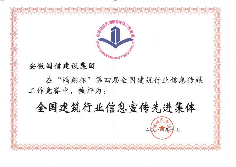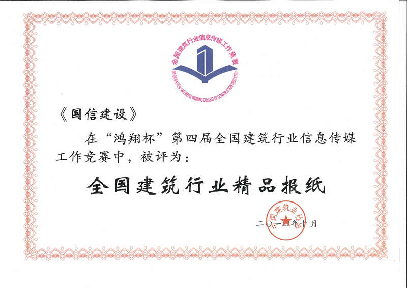 10月11日,中国建筑业协会在西宁召开全国建筑行业信息传媒工作经验交流会,对全国建筑行业参加信息传媒工作竞赛获得精品和优秀期刊、报纸、网站以及先进集体、优秀工作者进行表彰,来自全国的建筑行业协会领导和建筑行业信息宣传工作者共160余人参加会议。国信建设集团主办的《国信建设》报荣获“全国建筑行业精品报纸”奖,《国信建设》编辑部荣获“全国建筑行业信息宣传先进集体”称号。