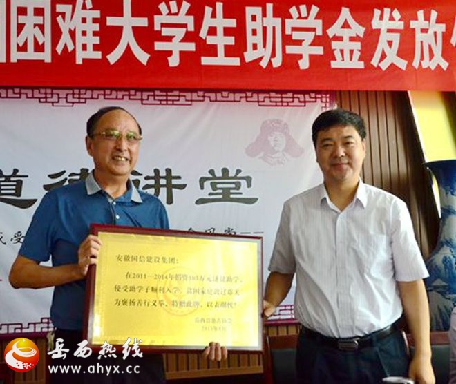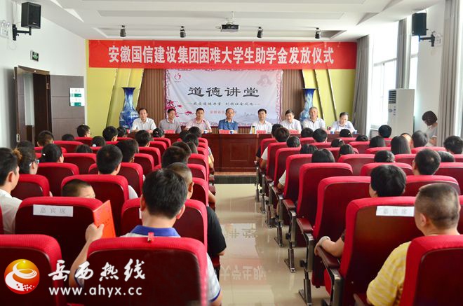 据岳西县人民政府网报道 8月18日上午,国信集团在岳西县举行困难大学生助学金发放仪式,宣布再捐助40名困难大学生,这是自2011年国信集团帮助36名困难大学生完成大学学业后的再次捐助。集团董事长何勋法、岳西县委书记周东明、人大常委会副主任陈彬彬等以及多名捐助代表出席发放仪式。