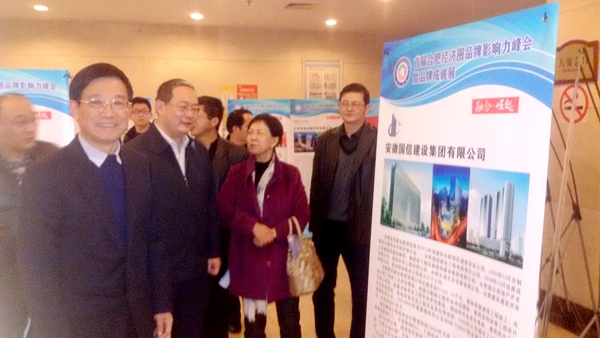 全国政协委员、安徽省政协原副主席、合肥市品牌战略发展研究会名誉会长王鹤龄,市委宣传部副部长王浩,市经信委主任李海鹰出席并讲话,图为王鹤龄等参观国信集团展牌。
