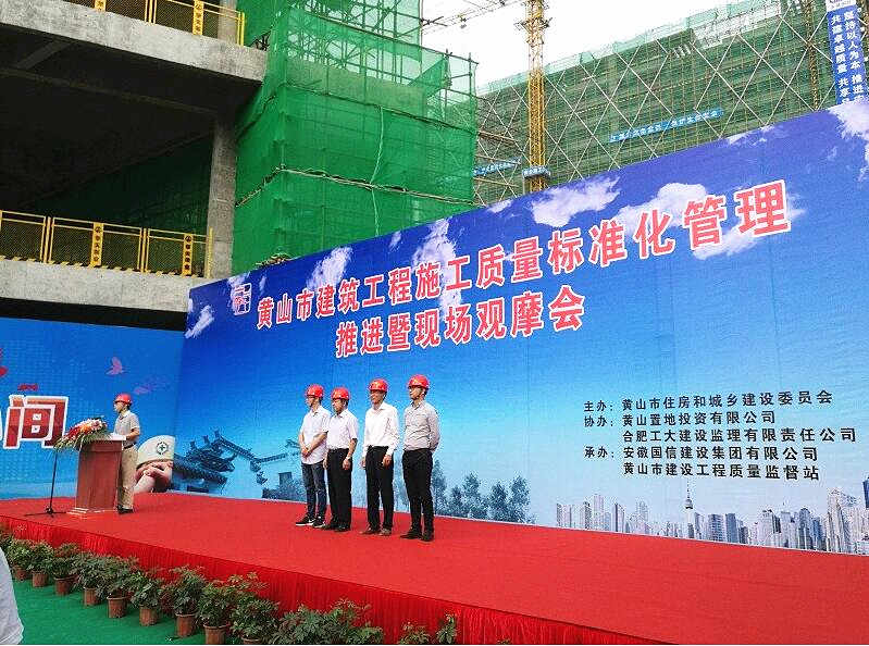 9月28日上午,黄山市住建委在国信集团承建的栢悦山项目施工现场召开了“全市建筑工程施工质量标准化管理推进暨现场观摩会”。黄山市质监站及屯溪区住建委负责人、各区(县)住建委分管领导、各区(县)质监站长及业务骨干、黄山市建筑工程施工总承包一二级企业技术及质量负责人等百余人参加了观摩会,黄山市质监局吕春华副局长出席了会议,黄山市住建委刘幸华副主任针对工程质量管理标准化做了重要讲话。