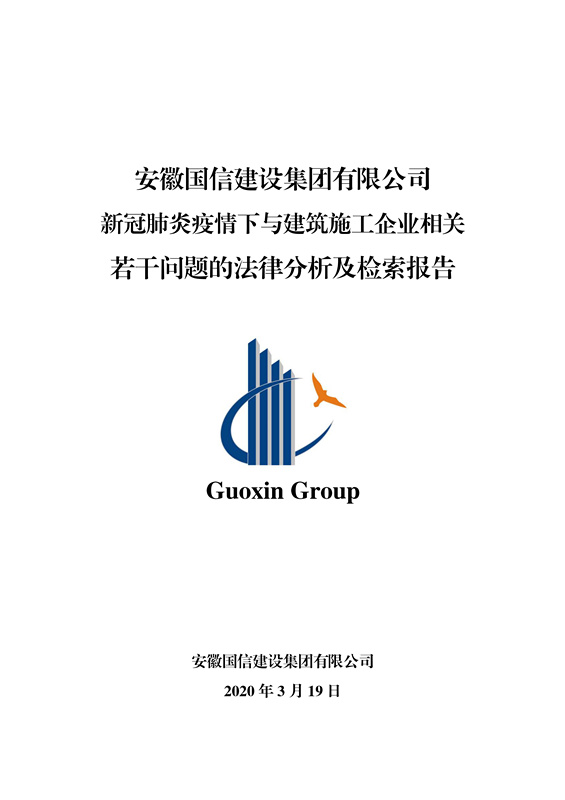 为依法依规防控疫情,系统防范法律风险,国信集团组织法律团队编制了《新冠疫情下与建筑施工企业相关的若干问题的法律分析及检索报告》。该分析报告针对新冠疫情给建筑施工企业造成工程延误、停工损失以及疫情防控而产生的成本增加等问题,从依法防控疫情、防范法律风险和全面复工复产的角度,予以详细政策解读、系统解答。依法科学合理运用该分析报告,有利于保证疫情期间积极稳妥、合法有序推进复工复产各项工作,完善法律风险防范体系,积极化解各类矛盾纠纷。