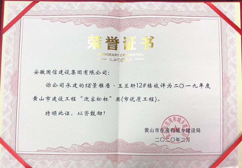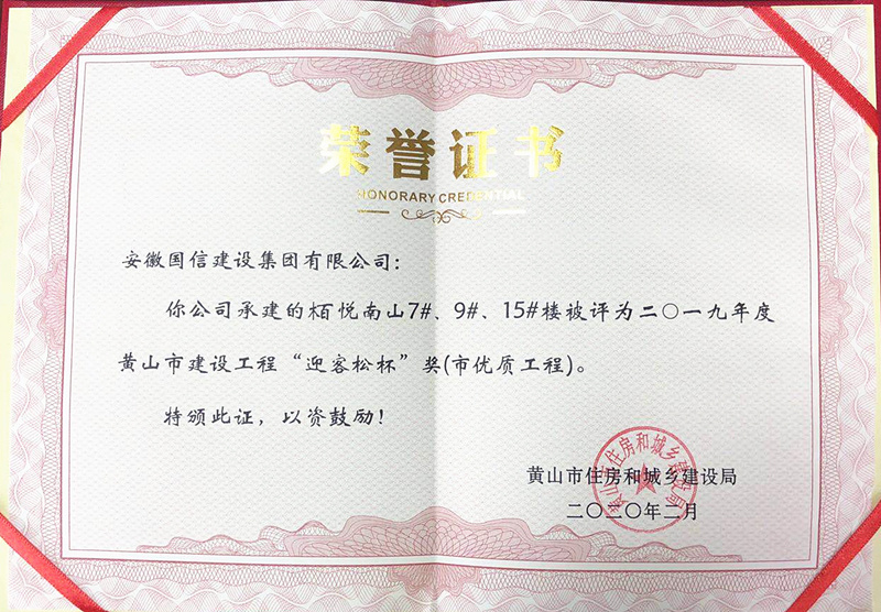 近日,从黄山市住建局传来喜讯,由国信建设集团承建的栢景雅居·玉兰轩12#楼,栢悦南山7#、9#、15#楼被评为2019年度黄山市建设工程“迎客松杯”奖(市优质工程)。
