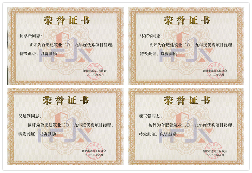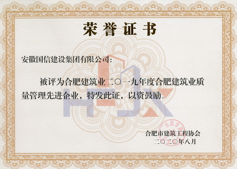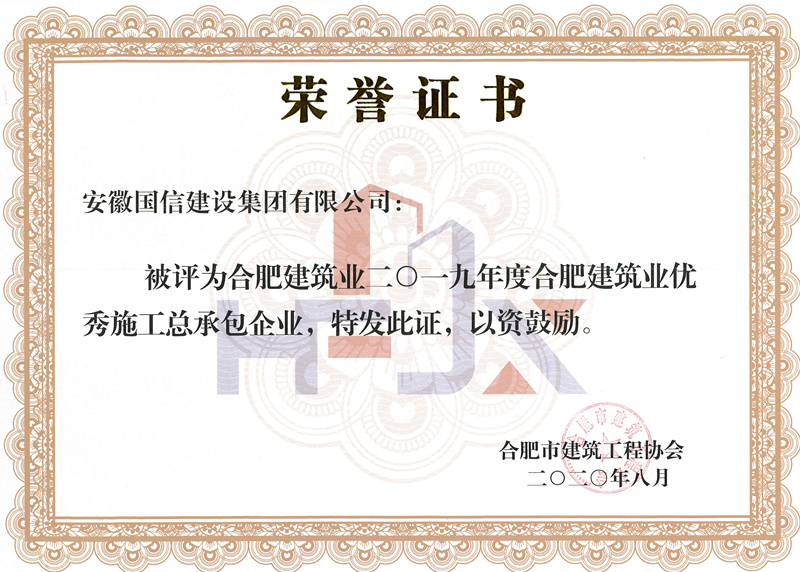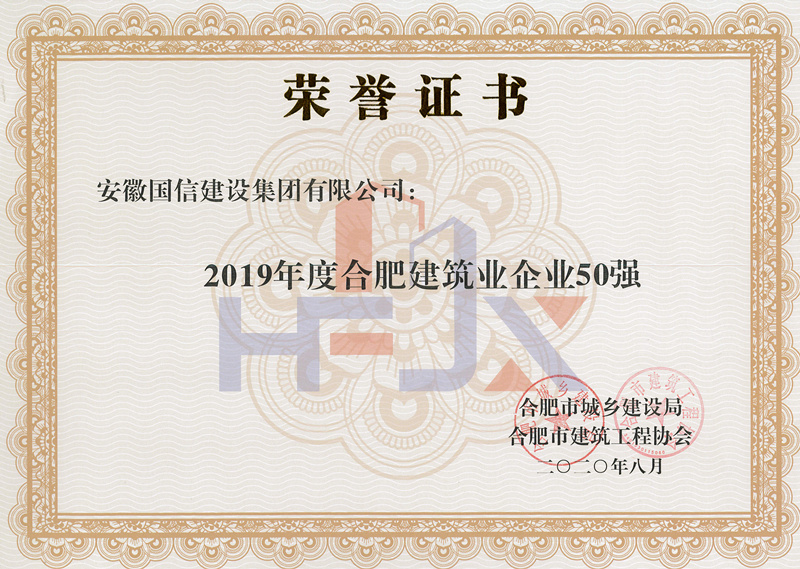 近日,合肥建筑业2019年度评优评先工作全面完成,国信集团喜获“2019年度合肥建筑业企业50强”“ 2019年度合肥建筑业优秀施工总承包企业”“2019年度合肥建筑业质量管理先进企业”“2019年度合肥建筑业安全管理先进企业”“2019年度合肥建筑业外向输出先进企业”等多项集体荣誉,何学松、马家军、倪旭钊、魏玉党荣获“合肥建筑业2019年度优秀项目经理”称号。